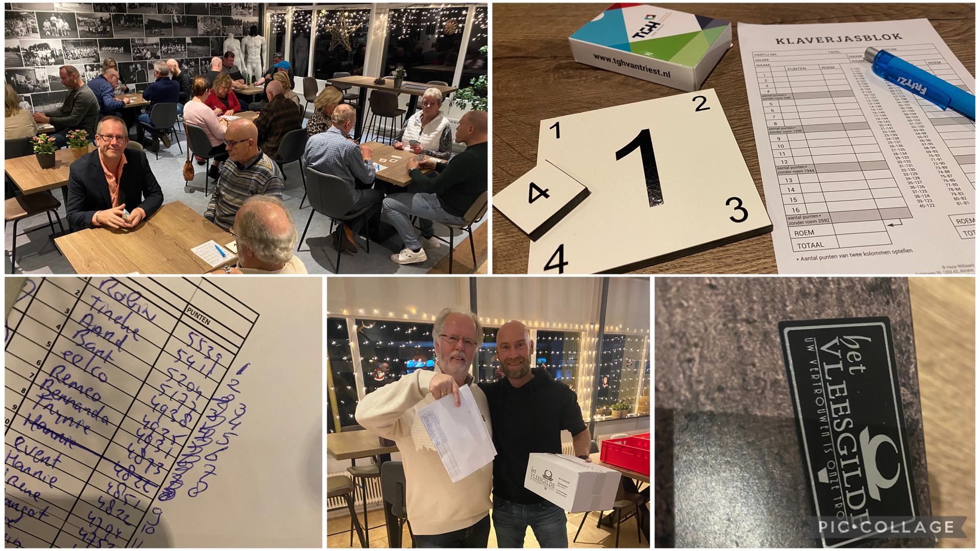 Afgelopen zaterdag werd weer het jaarlijkse Kerstklaverjassen georganiseerd. 24 deelnemers streden om de mooie vleesprijzen al ging het natuurlijk vooral om de gezelligheid. Er werd afgetrapt om 19.45 en tegen half 12 waren 3 rondes gespeeld en konden de scores bij elkaar opgeteld worden. In de tussentijd werden de deelnemers prima verzorgd door Wim en Harriet, dat kaartte een stuk makkelijker! Rieks en Gradus hadden het weer perfect voor elkaar en met dank aan de sponsoren Van Triest en Klok Betonboringen, kon iedereen naar huis met een leuke en vooral lekkere prijs. Het is de bedoeling dat rond Pasen weer een klaverjas toernooi wordt georganiseerd! En natuurlijk de prijswinnaars van deze keer