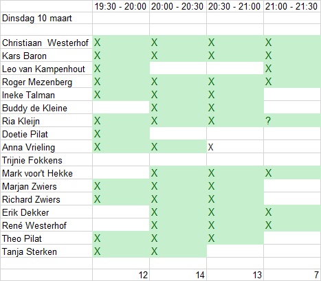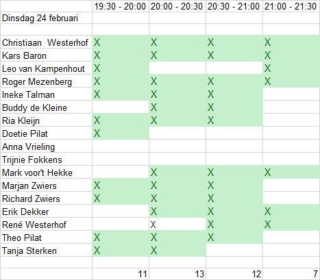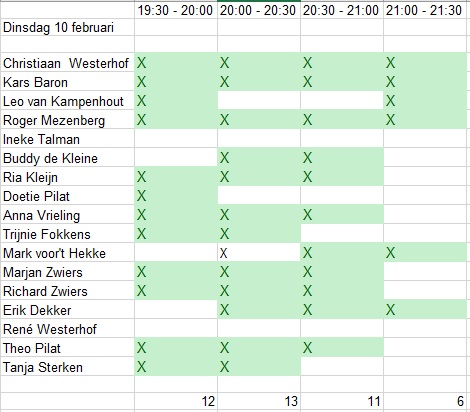 Bij een kruisje heb je aangegeven beschikbaar te zijn en als je vakje groen is ben je ingedeeld!